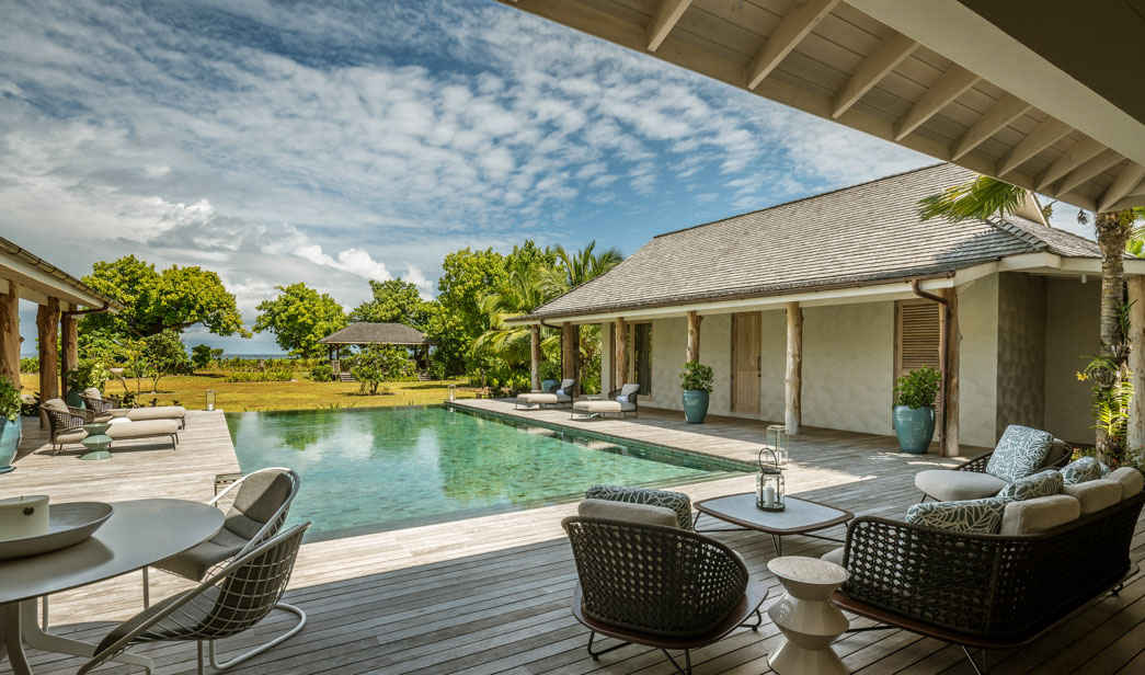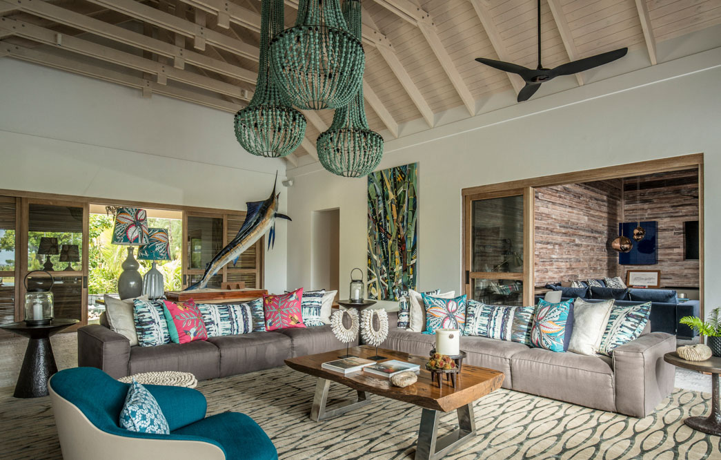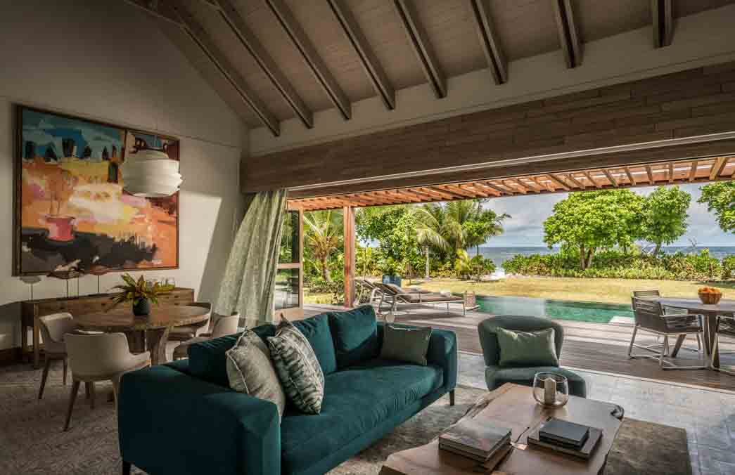 The comfortable and cosy living space is furnished with plush couches and armchairs, from where you can take in the lovely view of the outdoor swimming pool and the beach.