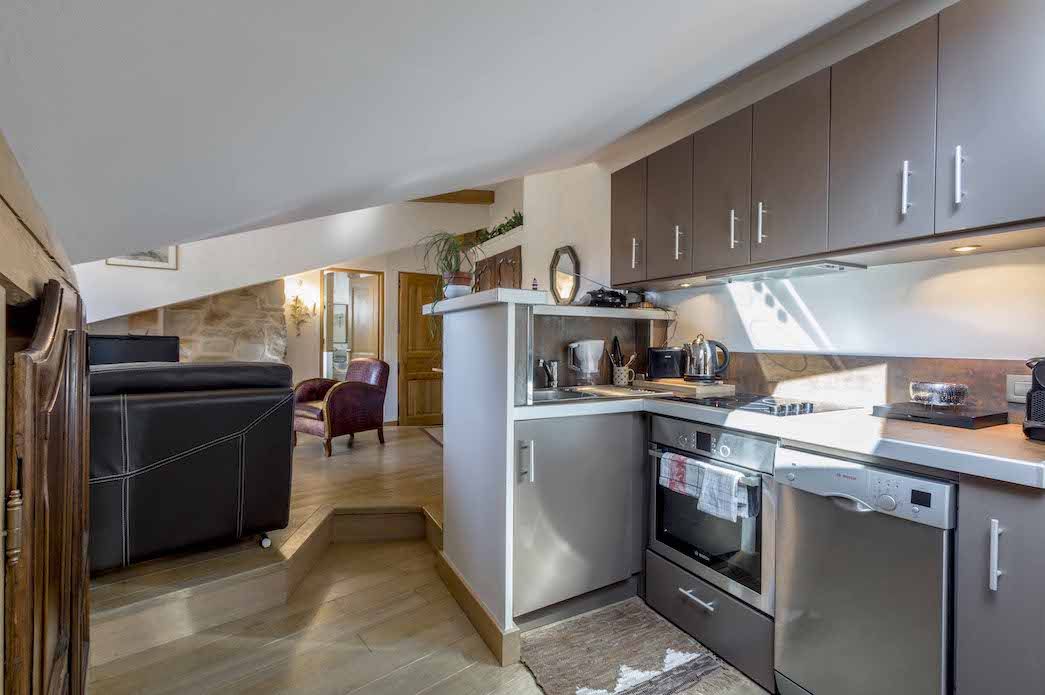 Grand appartement avec deux chambres dont un lit double et deux lits simples, salle à manger, salon avec TV et cheminéeUne kitchenette équipée