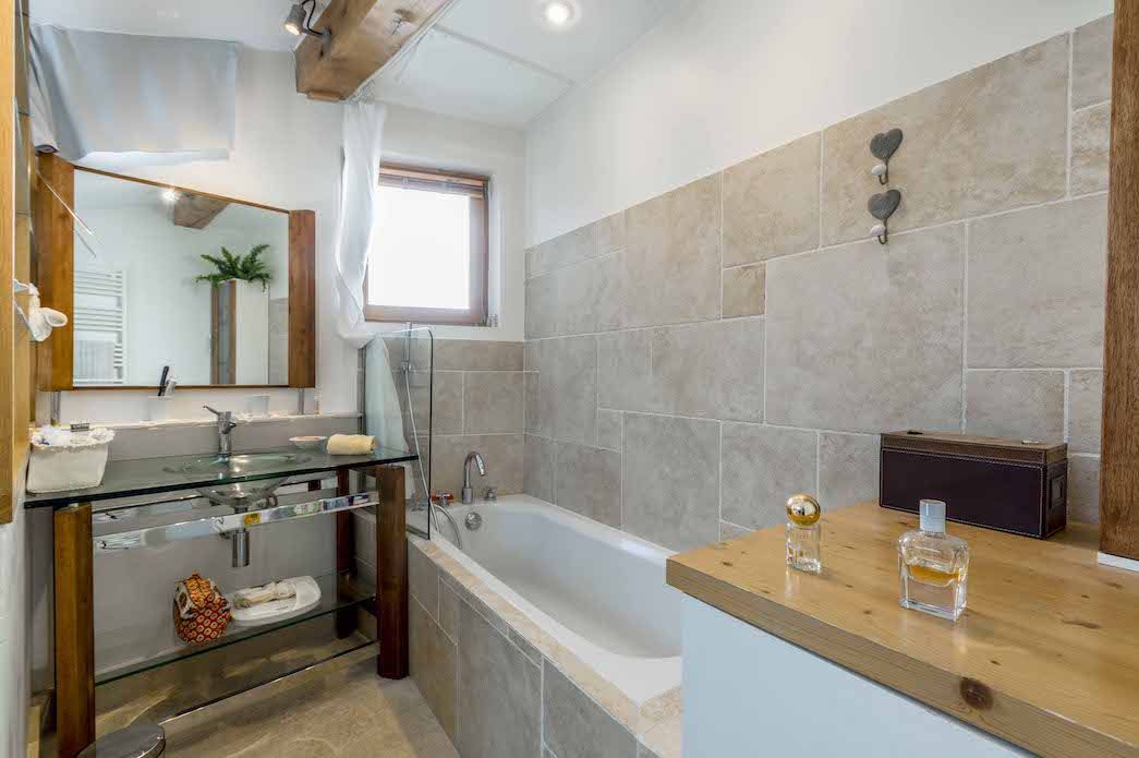 Salle de bain avec deux lavabos, salle de douche et deux toilettes séparées
