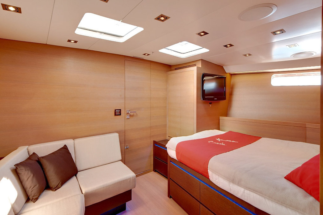 Le yacht exceptionnel Rocart est disponible pour la location en Méditerranée ou dans les Caraïbes. Ce bateau peut accueillir jusqu’à quatre personnes dans deux magnifiques cabines, toutes dotées d’une salle de bains privative. Les deux cabines disposent de leur propre téléviseur, de lecteurs DVD et de stations d’accueil iPod Bose. Il y a une bibliothèque de DVD à bord et une station de jeu pour divertir les enfants s’ils veulent s’échapper du soleil.