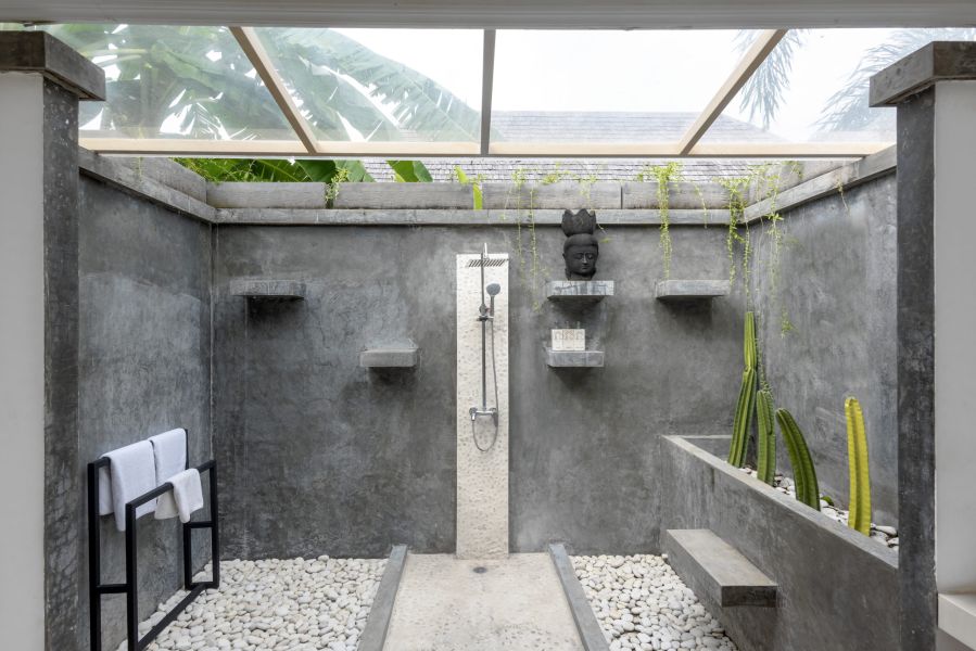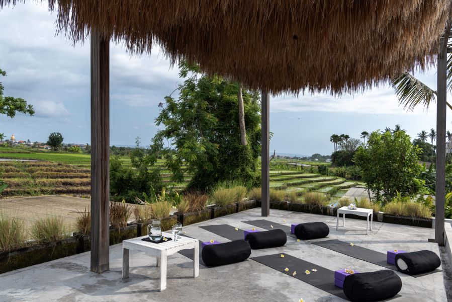 La villa se fond harmonieusement dans son environnement grâce à des structures en bambou et des meubles en bois. Les jardins clos et la terrasse en bois autour de la piscine sont luxuriants de plantes tropicales. Un escalier en spirale en acier près du salon mène à un pavillon surélevé où les hôtes peuvent admirer les rizières, contempler les magnifiques couchers de soleil de Bali et pratiquer des activités de bien-être comme le yoga et les massages.
