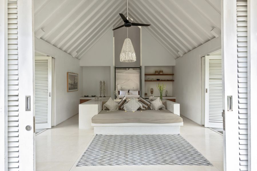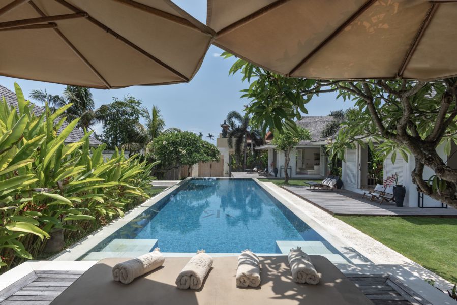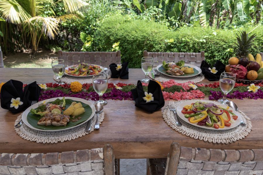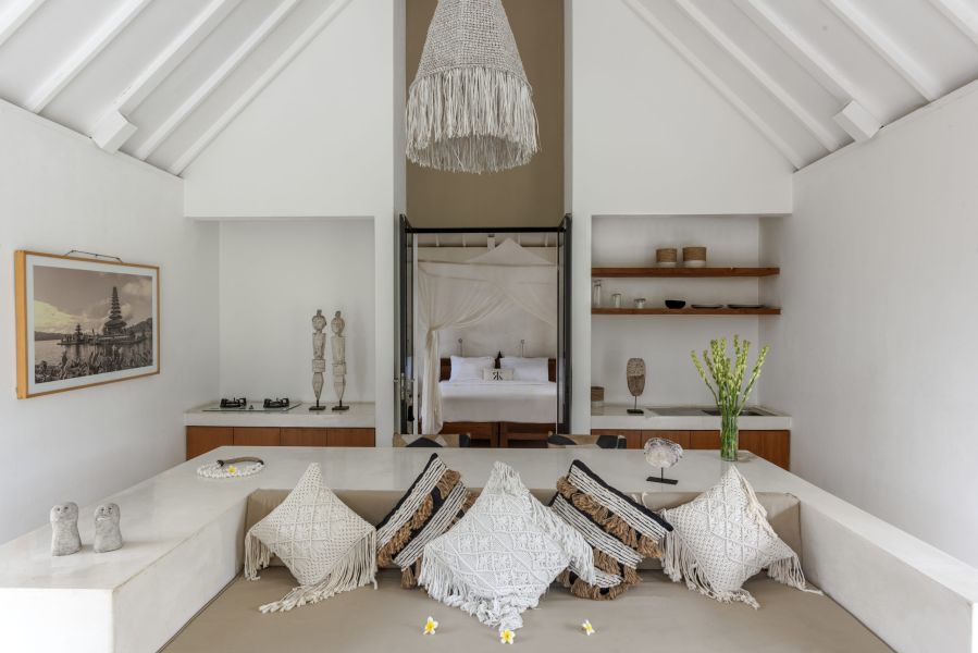 Les cinq chambres climatisées de la villa présentent un style apaisant et disposent chacune d’une salle de bains privative avec douche extérieure. Les chambres 1 et 2 sont adjacentes au salon principal, tandis que les chambres 3, 4 et 5 sont logées dans des bungalows individuels près de la piscine de 15 mètres. Le salon s’ouvre sur une salle à manger extérieure agrémentée de deux hamacs, où un chef privé compétent prépare des repas savoureux sous une voûte de tiges de riz séchées.