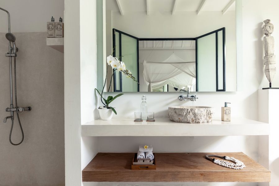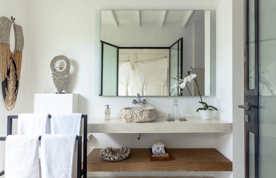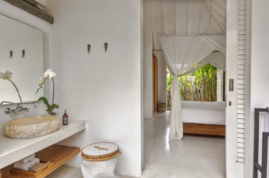 - Les chambres 1 et 2 de la villa principale sont adjacentes au salon et disposent d’une salle de bain en-suite avec douche de pluie intérieure et extérieure