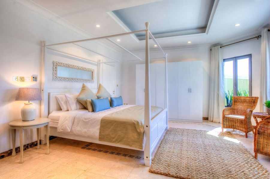 À l’intérieur, la villa propose cinq chambres spacieuses et aérées, toutes climatisées et dotées d’un dressing. Chaque chambre est équipée d’un lit king-size, d’une salle de bain privée, d’une télévision à écran plat, d’un lecteur DVD, d’un récepteur satellite et d’un coffre-fort personnel. L’espace inférieur comprend un salon et une salle à manger confortables et vastes, situés à proximité de la spectaculaire rotonde centrale et offrant un accès à la piscine extérieure privée et au jardin.