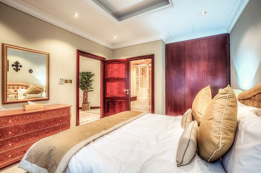 The villa features five airy, air-conditioned bedrooms, each elegantly furnished with a king-size bed, dressing room, and private bathroom. For your convenience and entertainment, each room is equipped with a flat-screen TV, DVD player, satellite receiver, and personal safe.