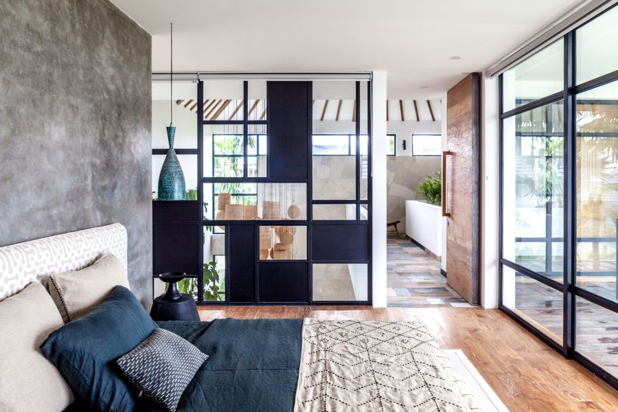 The villa has four trendy ensuite bedrooms around a private pool. Three bedrooms have big king-sized beds, and one is a kid’s room with bunk beds. The bathrooms are well-designed with concrete and pretty stones. The living and dining areas are big and comfy, with air conditioning to keep you cool. They have an indoor garden and big glass walls that make you feel connected to nature. There’s also a two-story living area that lets in plenty of light. Outside, there’s a cozy spot with a hammock by the 7 x 4-meter pool where you can relax.