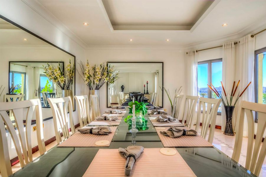 Inside, the villa offers five airy, spacious, and air-conditioned bedrooms, each with a dressing room, king-size bed, private bathroom, flat-screen TV, DVD player, satellite receiver, and personal safe. The ground floor features a comfortable and generous sitting and dining area adjacent to a spectacular central rotunda, with direct access to the private outdoor pool and lush garden.
